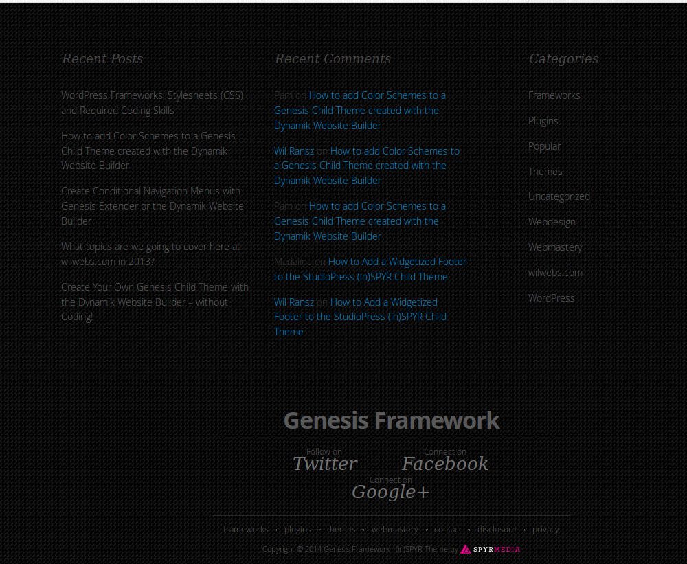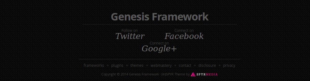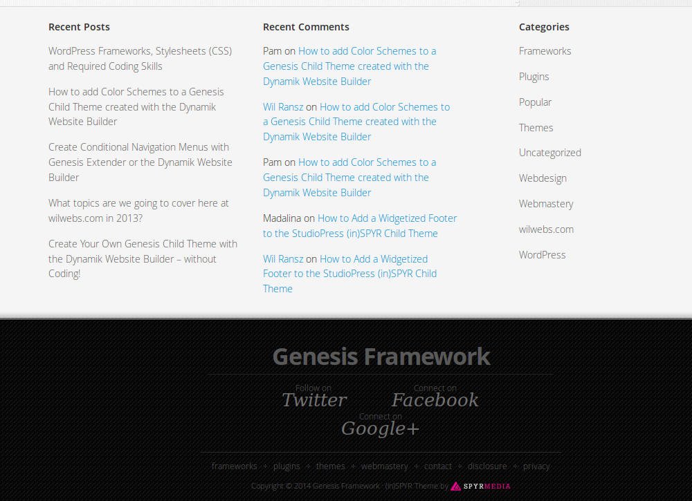 One of the themes concerned is StudioPress (in)SPYR, still one of my favorites and deployed on my (Dutch) blog wpZaken. Just as with previous editions, the current version 1.6.5 of (in)SPYR lacks a widgetized footer, however it does comes with a social footer presenting links to your profiles with Twitter, Facebook and Google+.