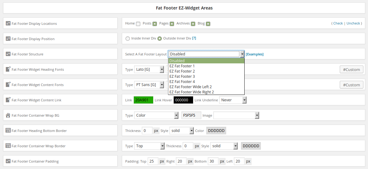 A Fat Footer is a footer with widget areas, and Dynamik lets you choose from six layouts for the Fat Footer – well, seven when you include ‘Disabled’.