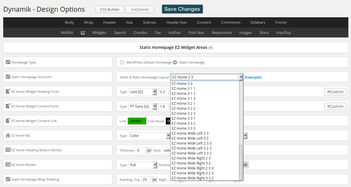 Next have a choice out of five dozen combinations of widget areas on the homepage. Just select the desired layout, and Dynamik will create the widget areas for you.