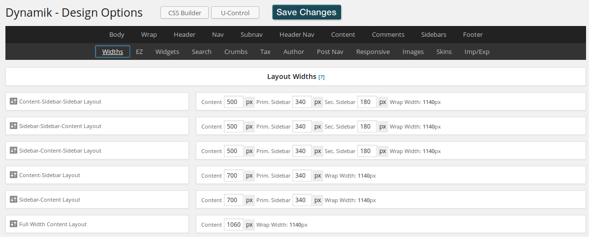With the Widths settings, you have the ability to set the column widths of these layouts. Just enter your preferred values and the wrap width at the right will tell you how broad your website will be including the necessary margins.