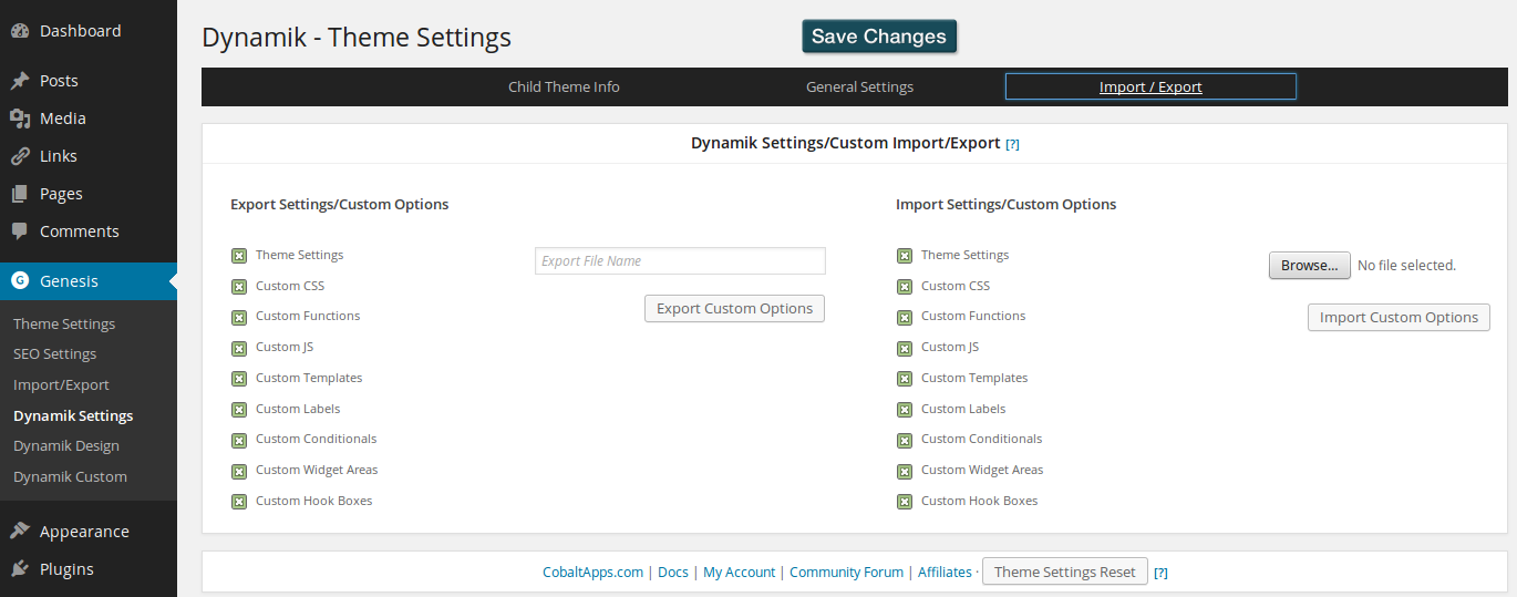 The Import/Export. options allow you to transfer your settings as entered within the Dynamik Settings page and the Dynamik Custom page.