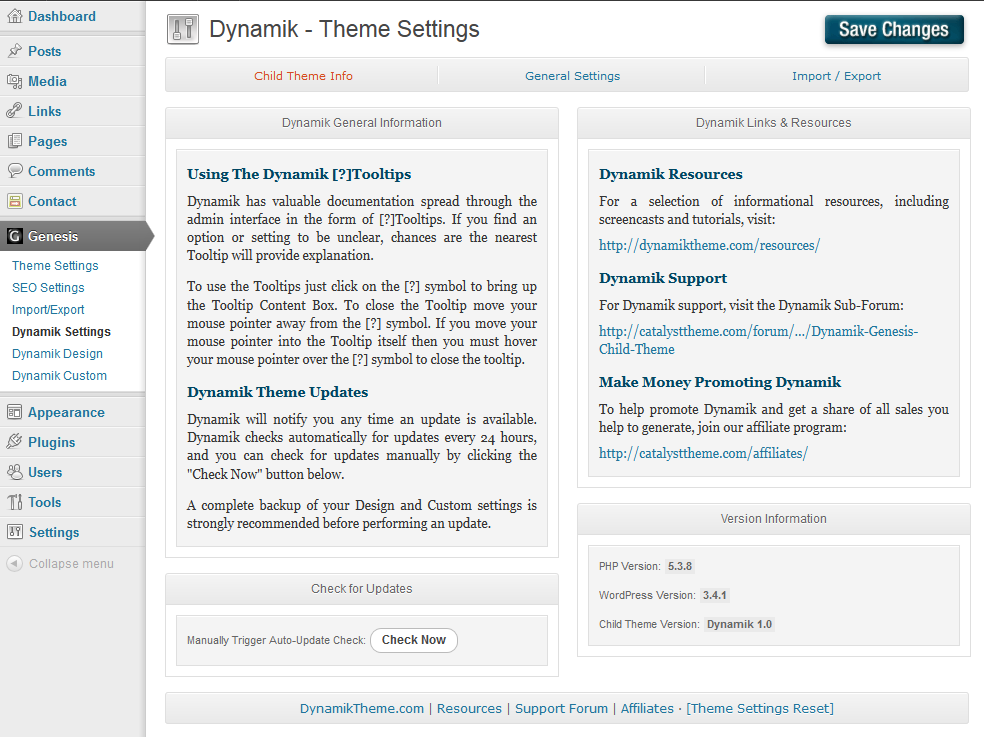 Those of you who have ever seen the back-end of the Catalyst Theme Framework will probably notice the similarities between the Dynamik Theme Settings page and the Catalyst Core Options page. Again signs that the Dynamik Website Builder is not just an ordinary child theme.