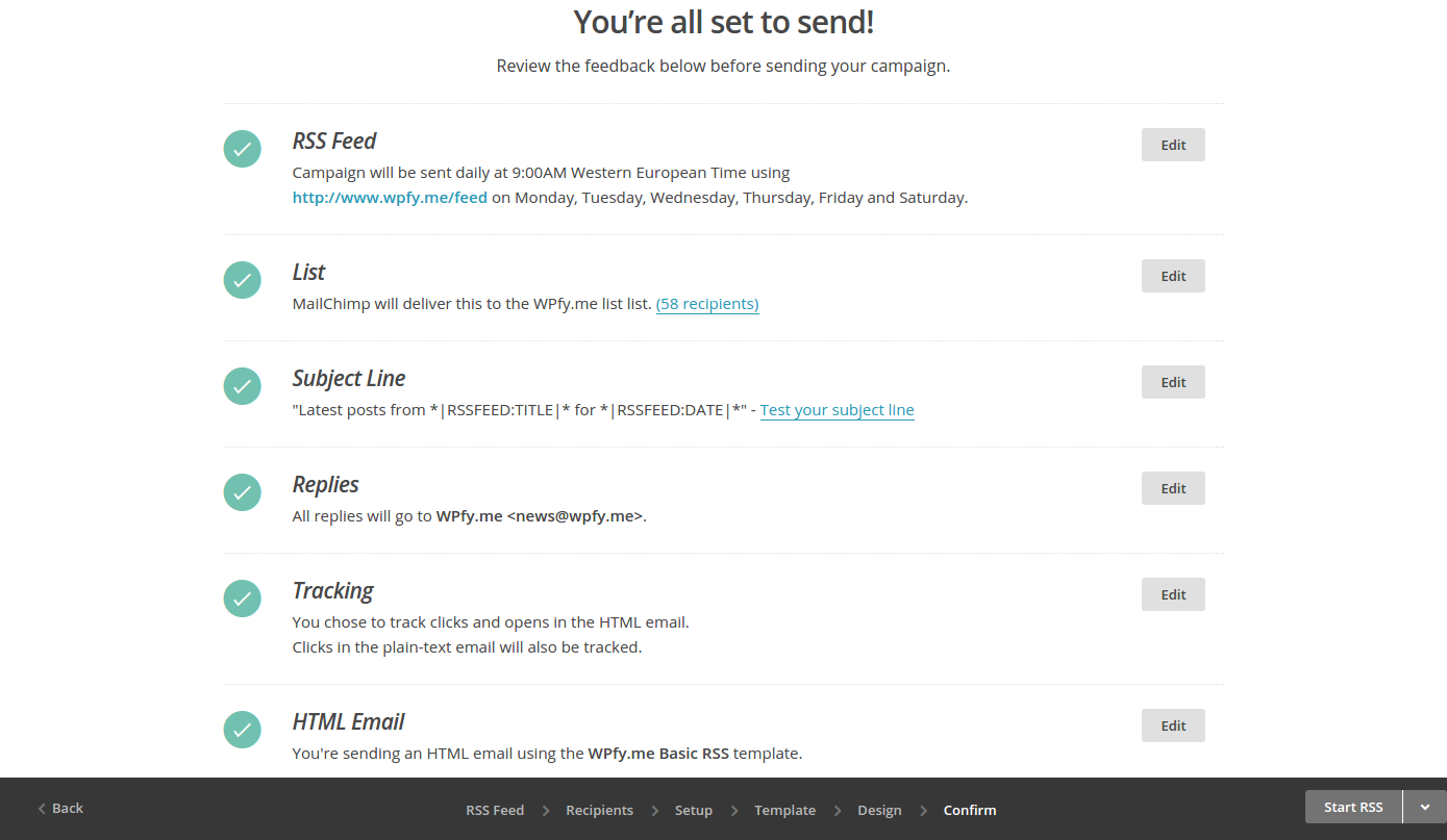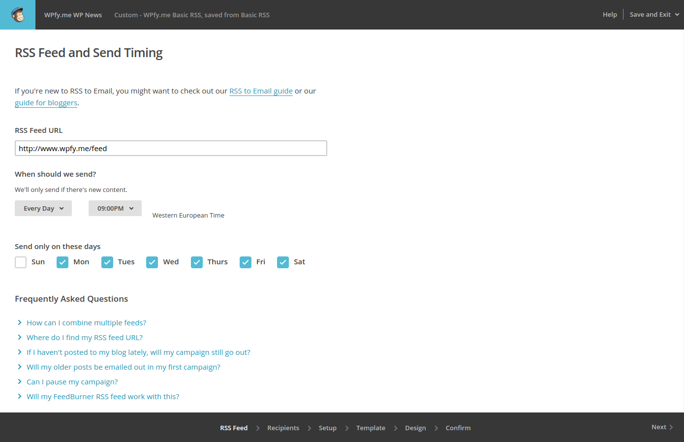 Let’s create such a campaign. You have to walk through six screens: RSS Feed, Recipients, Setup, Template, Design, and finally Confirm.
