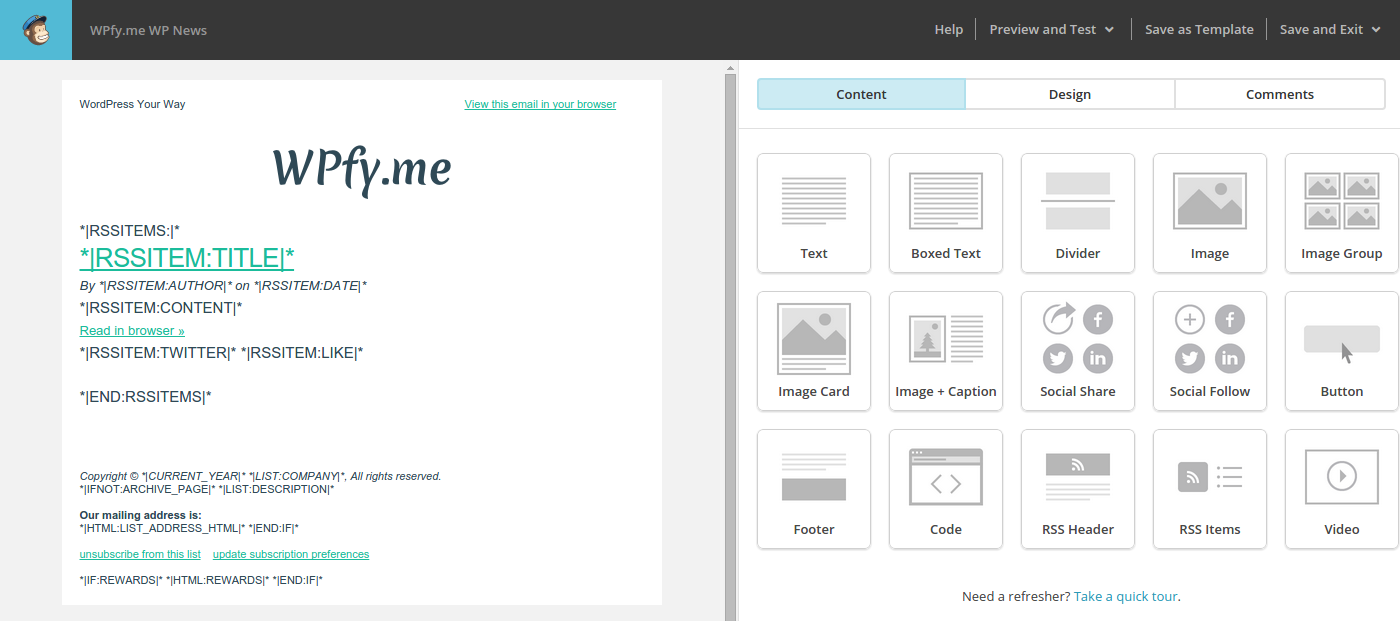 The Design screen is a very interesting one. Here you have the ability to adapt the template that you selected a step earlier. At the left you see the template including the template tags.