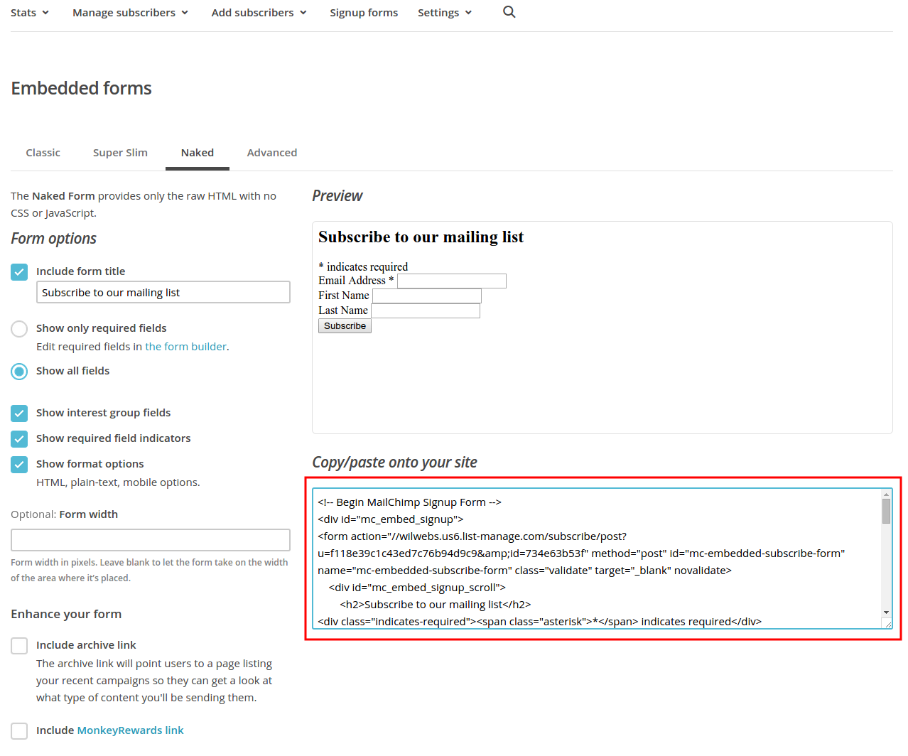 When you have a WordPress site and use a widget like Genesis eNews Extended or MailChimp for WordPress, a Naked Form is your best bet. Naked Forms are a kind of Embedded Form.