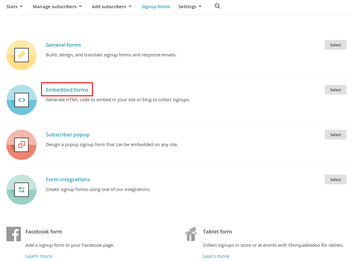 You need a sign-up form so that visitors are able to subscribe to your mailings. As with everything, MailChimp offers a ton of options, including a Facebook form and Tablet forms. The latter are very convenient for trade fairs, WordCamps and Meetups.
