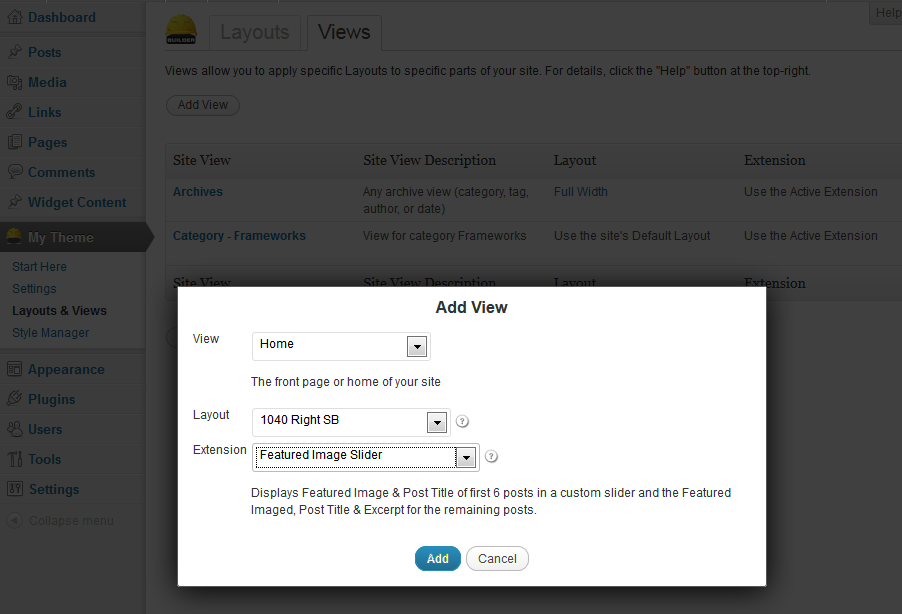 So, let us switch to the Views tab (Layout & Views >> Views) to add that a slider to the homepage. Builder ships with one additional View, named Archives. This Archives View applies to category, tag, author and date pages.