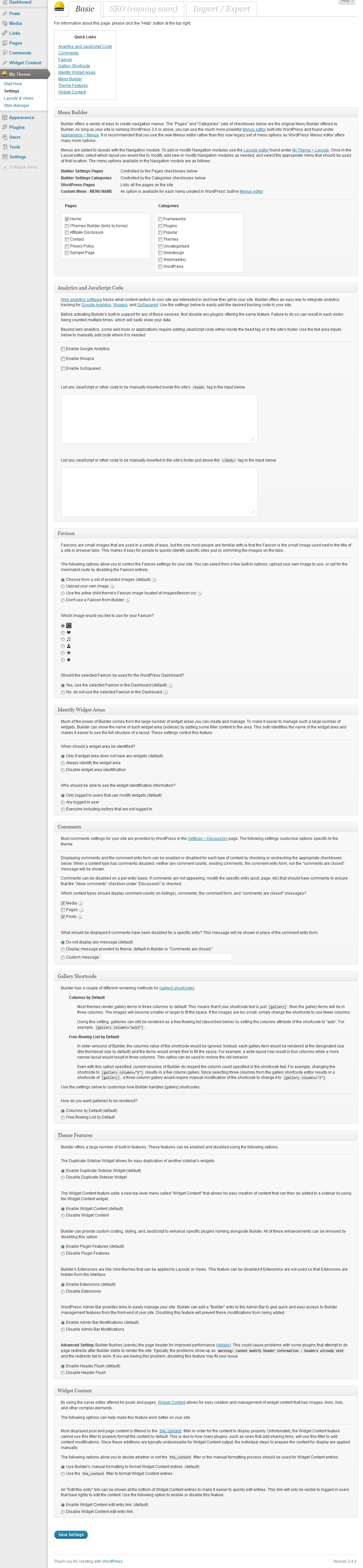 The Basic tab of the Settings page is where you customize your Builder installation. It contains toggle boxes for: