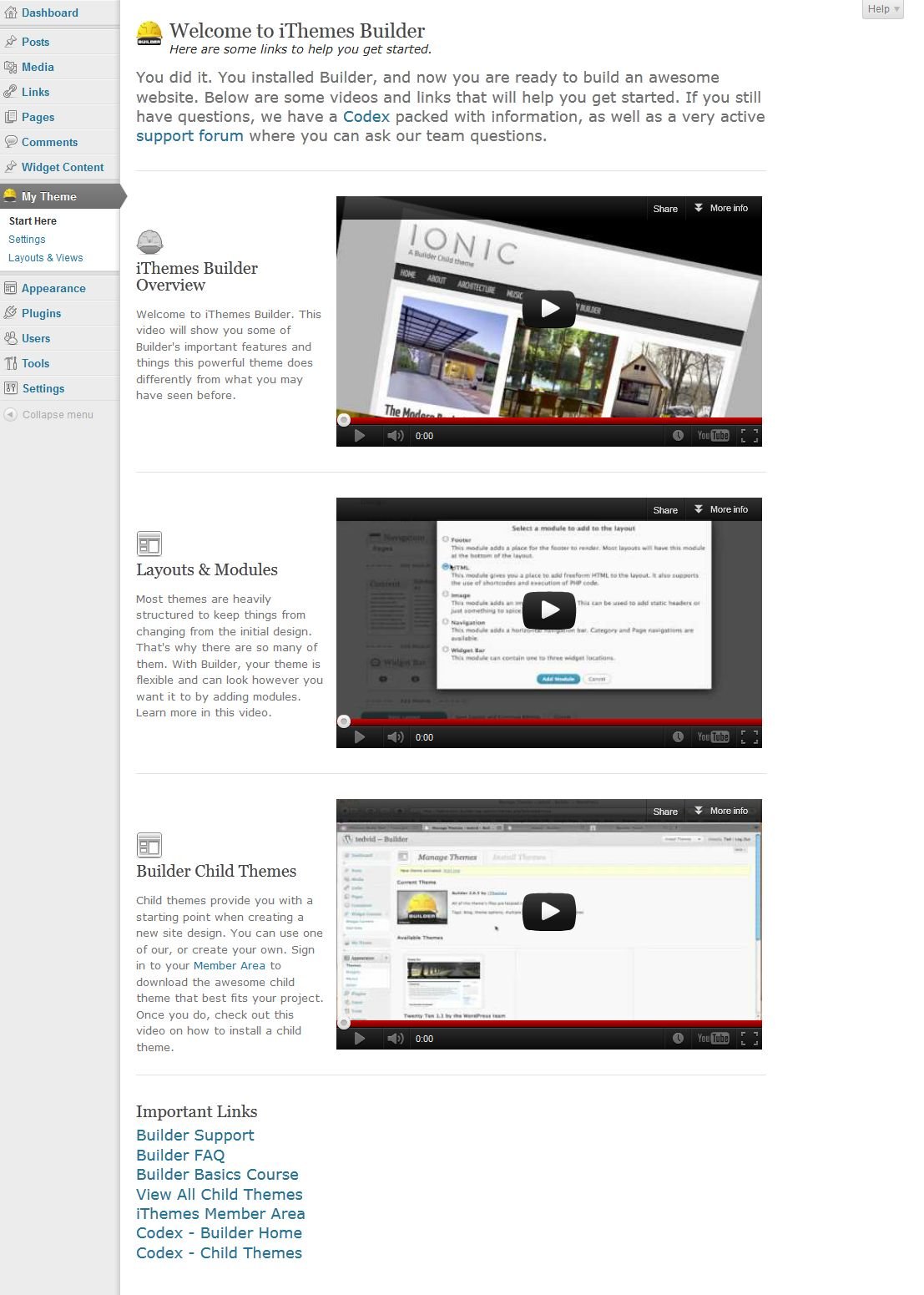 The Start Here page presents to you three short videos and links to resources on the web – like the codex and the support forum. Watching the screen cast will make you familiar with the concepts of iThemes Builder.