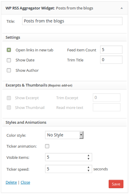 Which leaves us with WP RSS Aggregator. This plugin lets you produce lists of post titles with shortcodes. However, processing shortcodes in widget areas is not supported. To display a list with feed items in the sidebar, you need to purchase the Widget extension. Which I did.