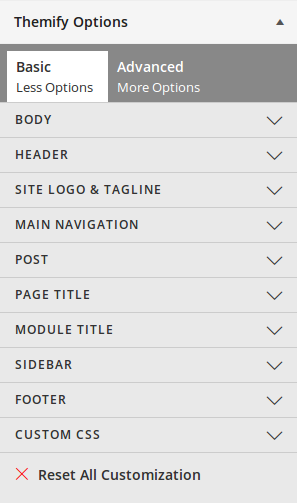 Things like selecting a color or uploading a background image for the body and header, or selecting your preferred fonts and colors for titles, body text, headings and navigation – all this is possible with the Basic Themify Options.