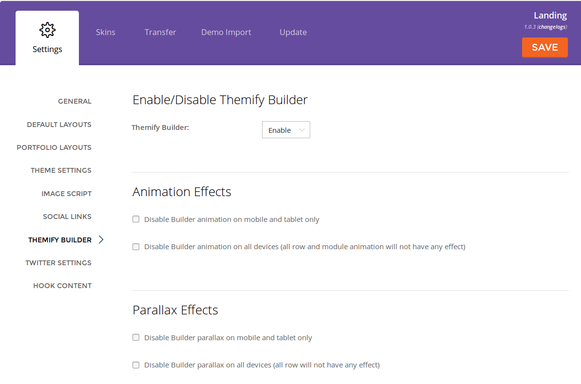 The Builder options let you disable the visual content editor completely, or just the Animation Effects and/or the Parallax Effects of the Builder.