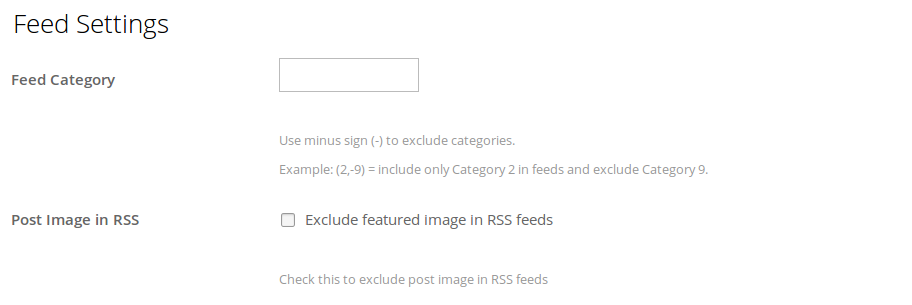 With the Feed Settings, you can exclude Post Categories from the RSS Feed. You can also exclude the Featured Image from your RSS Feed, simply by checking the appropriate box.