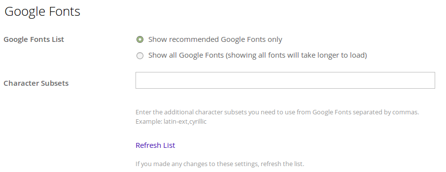 With the Google Fonts settings above you can choose to load all Google Fonts instead of the recommended subset.