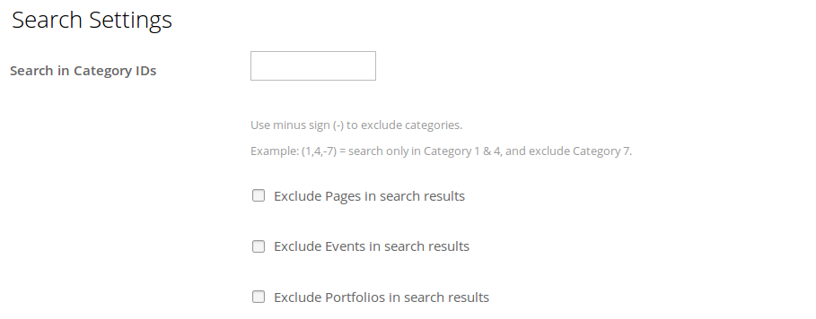 Much more interesting are the Search Settings. Here you can exclude Post Categories and available custom post types, so that these do not show up in the search results on the website.