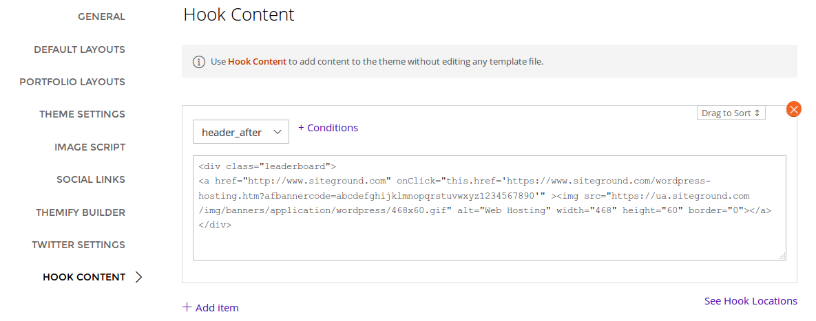 With the Conditions you identify where the code or content (here the add) will appear – all pages, just the homepage, etc. Themify has made it easy for you, this is merely a matter of checking boxes – no need to code.