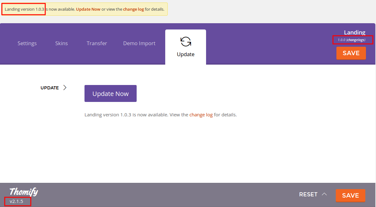 The upper right corner of the Settings states the version number of the theme regarding, while the number in the lower left corner reflects the version number of the framework.