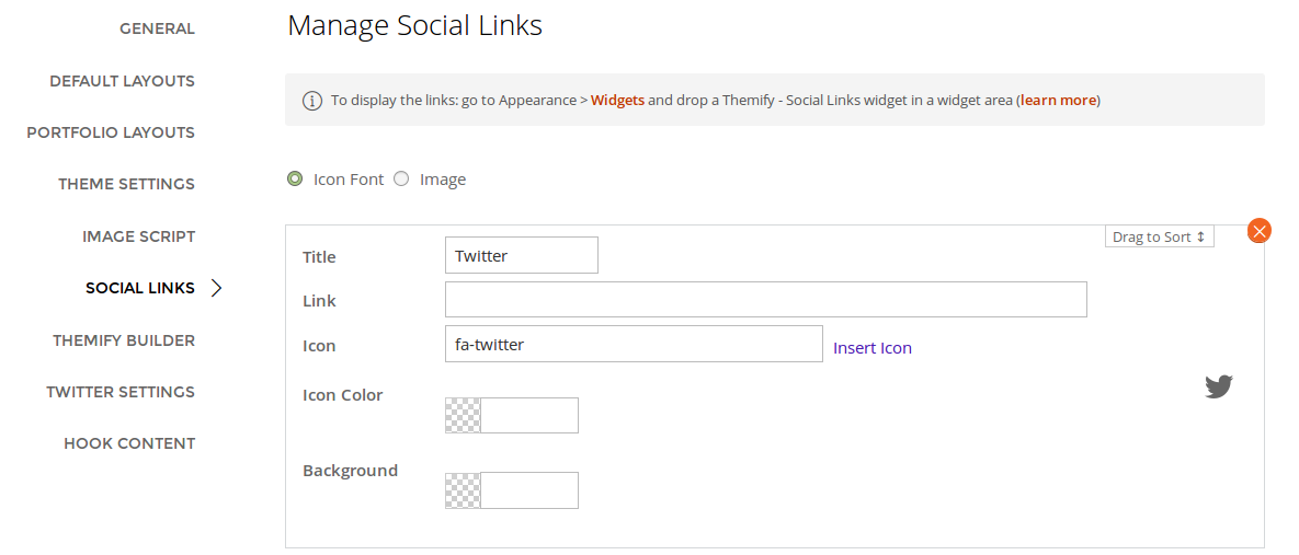 You can either use the Font Awesome font to display the icon of the social network, opt for the default Themify image icons, or upload your own. For each Social Link, you enter a title, the URL, and optionally an icon.