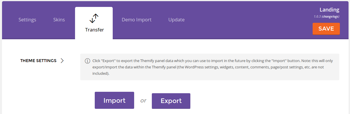 The Transfer tab facilitates the import and export of your theme settings.