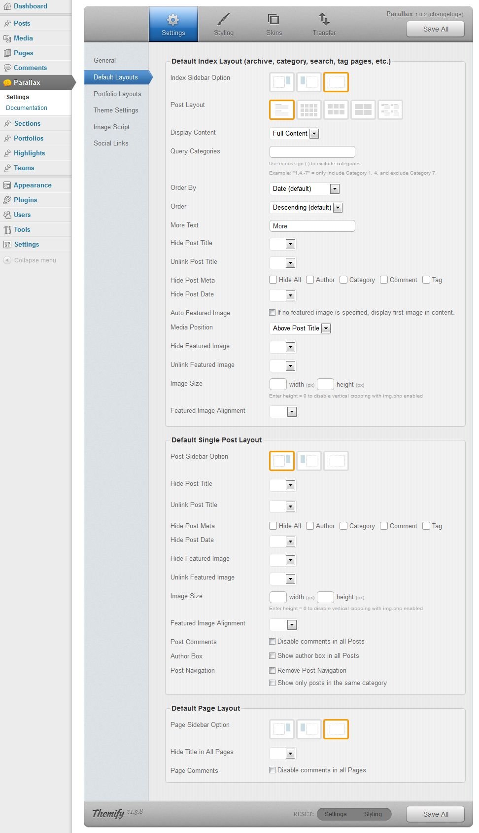 The default layouts for the index pages and single entry pages of your portfolio are set at the Portfolio Layouts. You have the ability to set your preferred sidebar options and portfolio layout – which can be either one, two, three or even four columns.