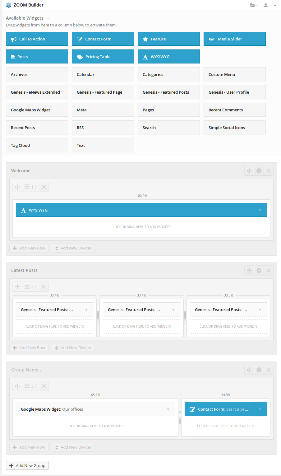 The available widgets are located at the top. The widgets with the blue background, are the (enabled) Builder Modules. The WordPress widgets show up with a light gray background – except those excluded within the ZOOM Builder Settings.