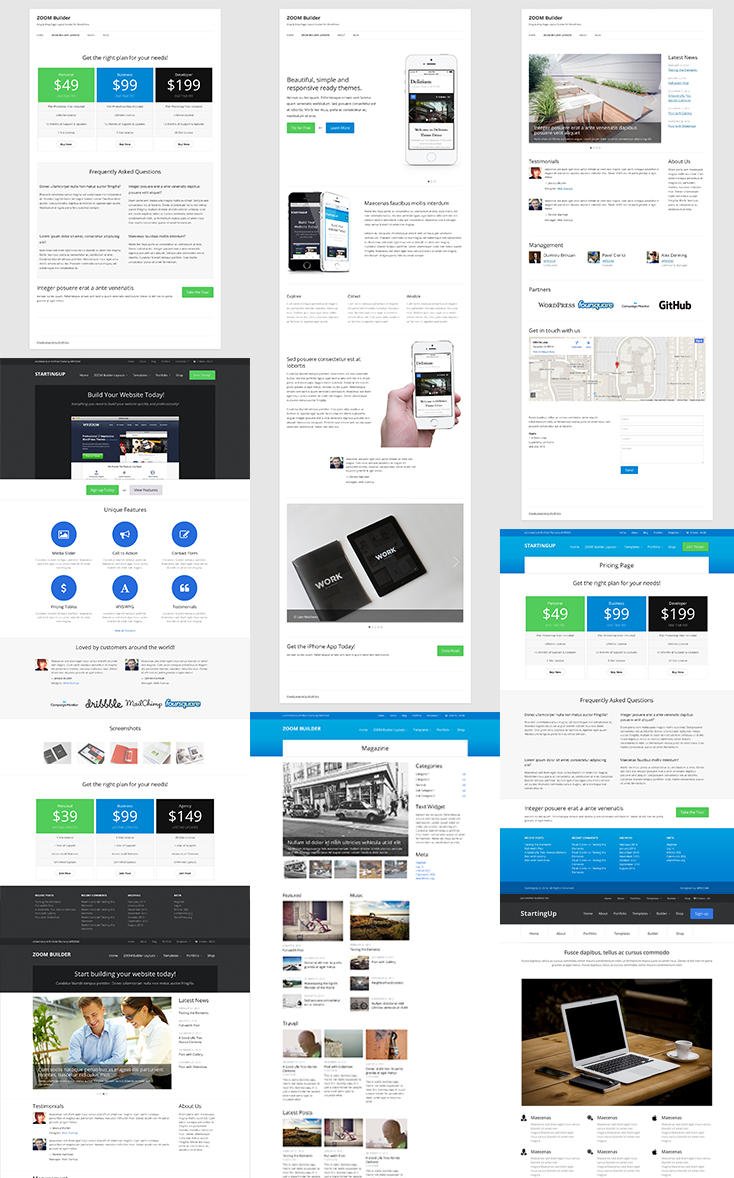 ZOOM Builder ships with 10 pre-built layouts: Agency, Contact Page, three Corporate layouts, two Landing Pages, Magazine, Plugins, Pricing Page, ZOOM Builder Modules, and iPhone App.