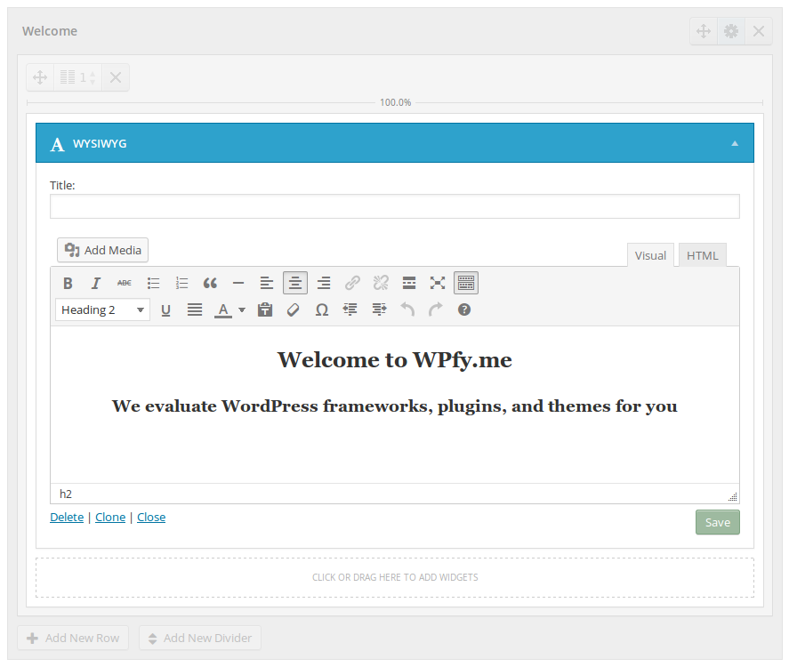 To begin, we need a full width top row for a welcome message. In order to create this text, we drag the WYSIWYG widget to the canvas.